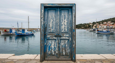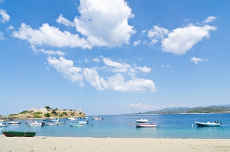 Under the perfect clouds, boats in a small fishing harbour by the beach in greece