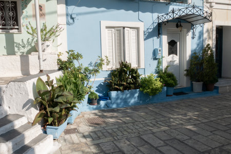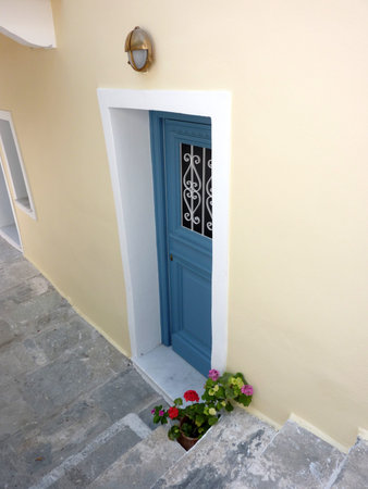 Narrow street in Neorio town on Poros island, Greece. Old white house with blue door and flowers
