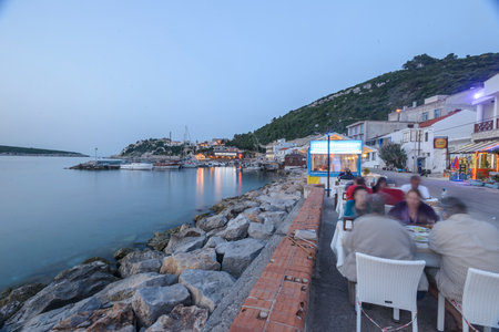 The promenade at the old port of the Greek Cycladic island of Tinos in the evening light