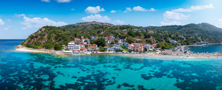 Chalkidiki, Greek coastal village landscape drone shot. Aerial day view of Neos Marmaras seafront at Sithonia peninsula with low rise buildings.