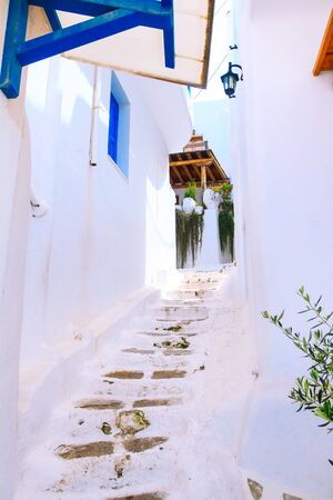 Greek traditional architecture, street view with white and blue house staircase close-up
