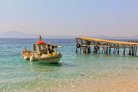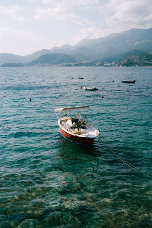 Small boat is anchored near the shore on a sunny day. Against the backdrop of mountains and sea