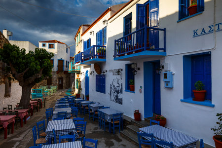 KOKKARI, SAMOS ISLAND - SEP 25, 2015: Tables with chairs in traditional Greek tavern in Kokkari town on coast of Samos island, Greece