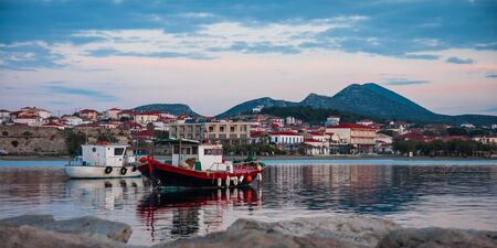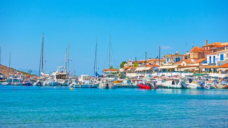 Seaport of the Evdilos village of the island of Ikaria, North Aegean Greece, summer destination, fishing boats and touristic resort.