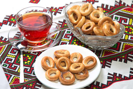 Bagels and cup of tea on the tablecloth with ornaments.