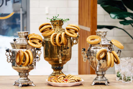 Russian tea and sweets. Samovar and bagels. Traditional treats in Russia. old samovar. Details of holiday.