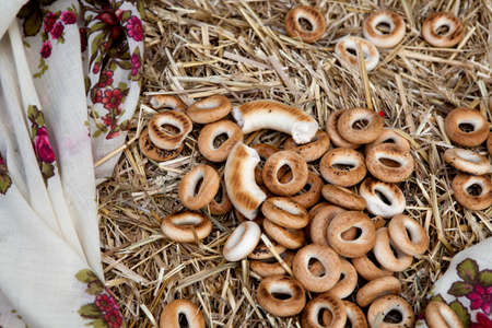 Dryings of a donut form russian meal - bread-rings lying on straw