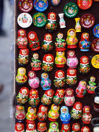 Matrioshka at the street market, iconic popular souvenir from Russia, Ukraine. Colorful bright russian nesting dolls. National present doll