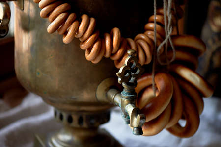 Russian vintage samovar for boiling water for tea. On the samovar hang a bundle of bagels.
