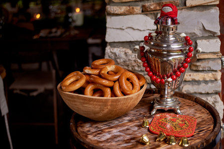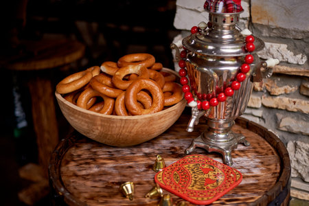 Donut on a string. Traditional Russian pastries. Samovar and tea in an old clay mug.