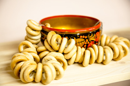 Russian dessert Sushka (drying) are on the shelf next to the bowls painted with Khokhloma ornament.