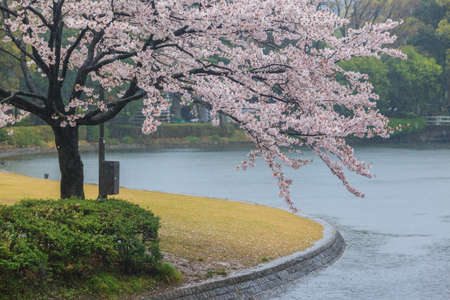 Pink sakura flower during raining at Japan