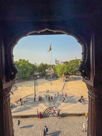 A group of people are gathered in a courtyard with a flag flying in the background. The flag is red, white, and blue, and it is waving in the wind. The people are standing around, Shaniwar Wada Pune.