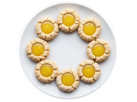 Seven lemon thumbprint cookies arranged in a circle on a white plate isolated on a transparent background
