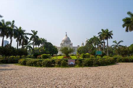 Calcutta, India - March 24, 2024: The image shows a wide view of the Victoria Memorial building with its white marble dome and towers, surrounded by landscaped gardens, palm trees, and signage in the foreground under a clear sky.