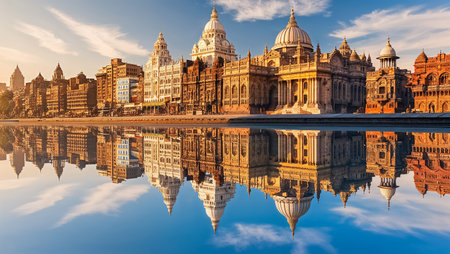 A picturesque scene featuring urban architecture alongside a tranquil lake, with reflections of the city under a vibrant blue sky and fluffy clouds.
