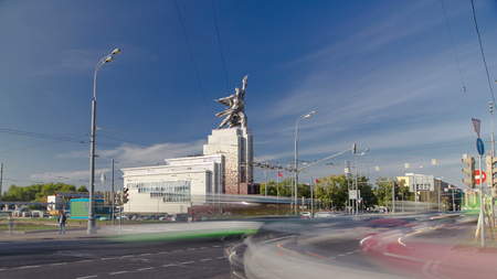 Industrial Worker and Collective Farm Girl monument from road, timelapse hyperlapse Moscow, Russia 4K