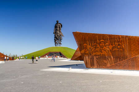 Volgograd, Russia - 08 08 2021: the famous The Motherland Calls statue, the tallest statue in Europeand the tallest statue of a woman in the world. People at the base give a sense of scale