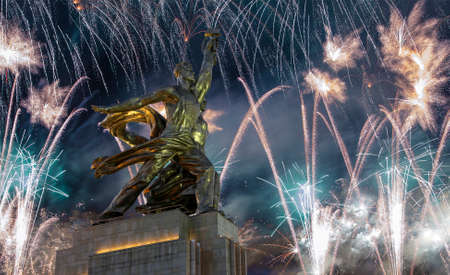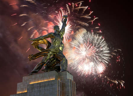 Soviet monument Rabochiy i Kolkhoznitsa ( Worker and Kolkhoz Woman) of sculptor Vera Mukhina (made of in 1937) and fireworks in honor of Victory Day celebration (WWII), Moscow, Russia