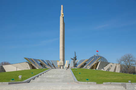 Monument to the Liberators of Soviet Latvia and Riga from the German Fascist Invaders. Sculptural group of Soviet army solders with rifles. Riga, Latvia - May 1, 2021