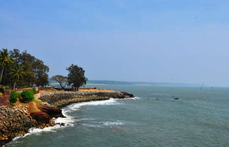 View of seashore in the afternoon with moss covered rocks and line of coconut trees, Arabian sea, kerala, indian coast