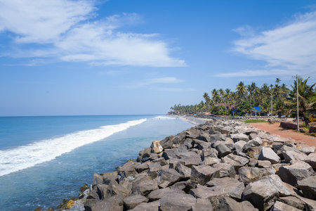Large boulders form a protective seawall along the shoreline of Varkala Beach, India, with gentle waves and a line of palm trees under a bright blue sky. The scene is sunlit and tranquil, evoking a relaxed tropical atmosphere.