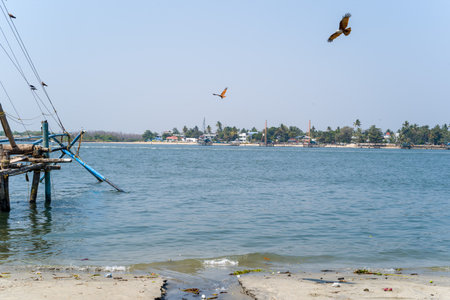 Kochi, India - February 27, 2023: A partial Chinese fishing net structure is visible on the left, with several birds perched and flying above the water, and buildings and palm trees on the opposite shore.