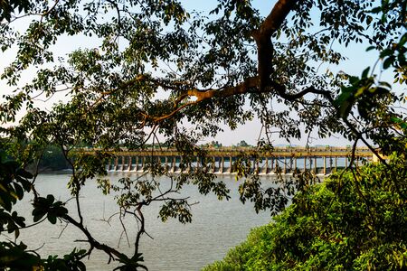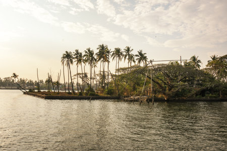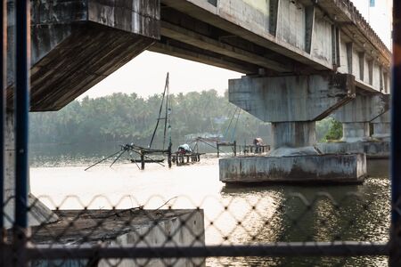 Chinese fisher net under a bridge along the kollam kottapuram waterway along palm tree river shore, Kerala, India