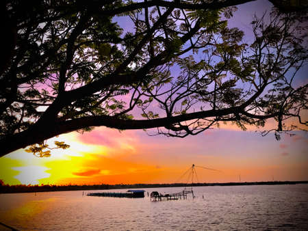 Sunset on dark waters with palm trees in foreground, with no people Kerala, India