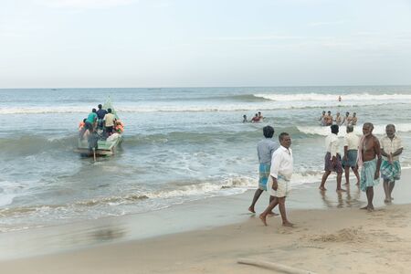 Indian fishermen with boat at the coast. Mahabalipuram, Tamil Nadu, India. 2015-08-27