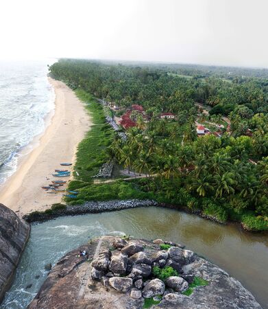 Beautiful view of ocean, beach, summer houses and palm trees in Varkala, Kerala, India