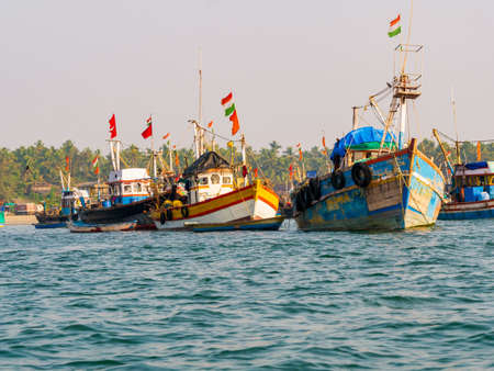 Sindhudurg, INDIA - December 23, 2021 : Troller type fishing boat at coastal maharashtra region. Sindhudurg district listed in 30 favorite tourist destination around the world.