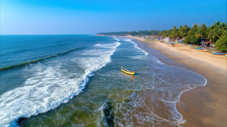 A breathtaking view of a tropical beach with gentle waves, a colorful fishing boat, and lush palm trees under a clear blue sky, perfect for travel lovers.