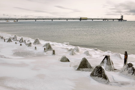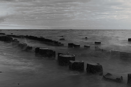 Dark winter days in Sopot, white swans birds swimmen in Baltic sea near old pier in Sopot, Poland