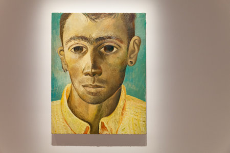 Venice, Italy - April 19, 2024: The painting of Louis Fratino titled Alessandro in a Seersucker Shirt exposed at the Central Pavilion during the 60th International Art exhibition of Venice biennale 2024, titled Foreigners Everywhere curated by Adriano Ped