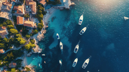 An aerial view of a beautiful coastal city with boats sailing, showcasing the harmony of land and sea from above.