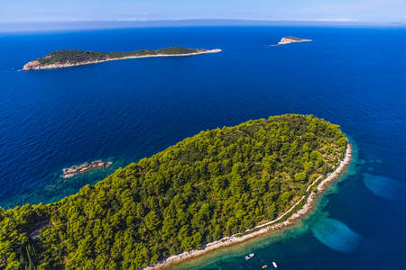 Aerial helicopter shoot of Adriatc landscape with two islands - Dubrovnik archipelago, Croatia.