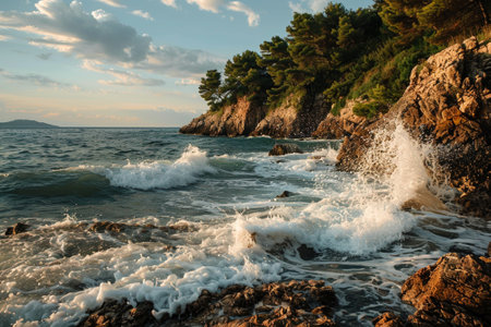 Rocky seashore, beach with green pine trees at sunset. Nature of Montenegro. Natural, texture background. Turquoise calm Adriatic Sea. Green coniferous forest. Scenic seascape. Wallpaper, copy space