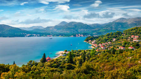 Attractive morning view of Slano town on the west seashore of Croatia, Europe. Captivating summer seascape of Adriatic sea. Beautiful world of Mediterranean countries. Traveling concept background.