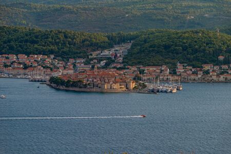 Aerial view of Korcula town on the island of the same name. View from Peljesac peninsula.