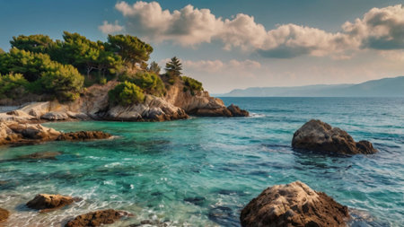 Discover a stunning coastal landscape featuring rocky shores and clear blue waters, perfect for anyone seeking tranquility and natural beauty under a bright sky.