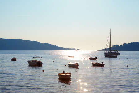 Bay with boats and yachts . Beautiful sunrise over the sea . Sunny morning at the seaside