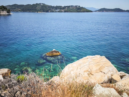 Aerial drone views over a rocky coastline, crystal clear Aegean sea waters, touristic beaches and lots of greenery in Skopelos island, Greece. A typical view of many similar Greek islands.