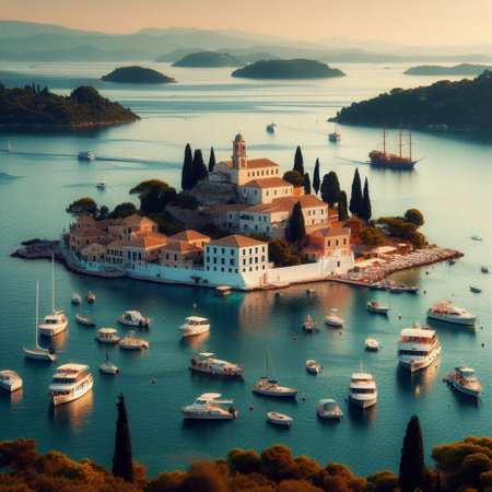 Sailboats sail along the Kotor Bay to the island of Mamula. Montenegro