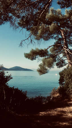 view on rocky islands in the sea and clear blue sky. Blurred green trees in foreground