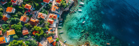 Aerial View of a Seaside Village: picturesque layout of a seaside village from above, small boats docked by the shore, vibrant rooftops, and empty winding streets.