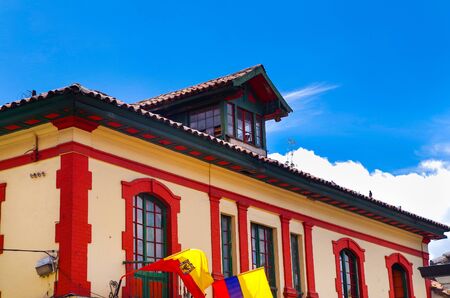 Beautiful outdoor view of colorful buildings of La Candelaria, historic neighborhood in downtown Bogota, Colombia
