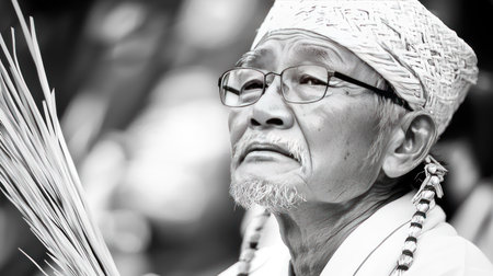 A serene male model in traditional attire with a blue hat, immersed in meditation amidst a smoky backdrop, exuding tranquility and spirituality during a cultural ceremony