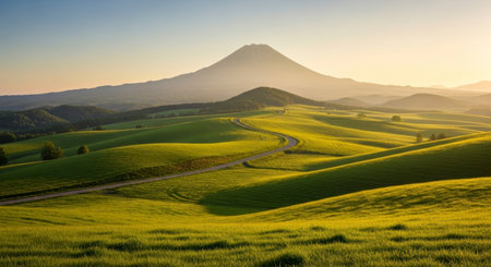 A serene landscape with rolling green hills illuminated by golden hour light, featuring a winding road leading towards a majestic mountain under a clear sky.
