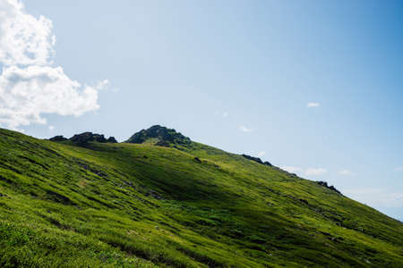 Mountain landscape with green grass and blue sky. Caucasus Mountains, Georgia.